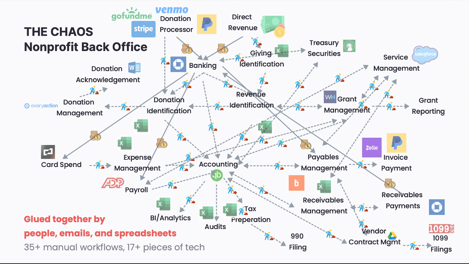 I wanted to walk you through just a tiny bit of what we’ve come up with for the people on the front lines, the ones trying to help people far and wide. Sadly, they’ve been left to deal with a rat's nest of solutions and providers to track their finances, which are the lifeblood of any nonprofit project. That was a recipe for disaster, so we set out to solve that pain.