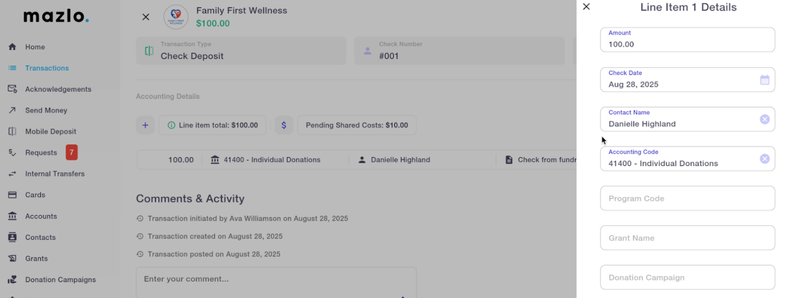 For a non-profit, every dollar in and dollar out triggers a workflow that has to be auditable and compliant. So, what we’ve done is we've taken those transactions and we’ve enriched them with accounting details, receipts, comment threads with staff and admins, statuses and more. In the case of a donation, adding specific accounting codes will trigger a generation of a donation acknowledgment letter.