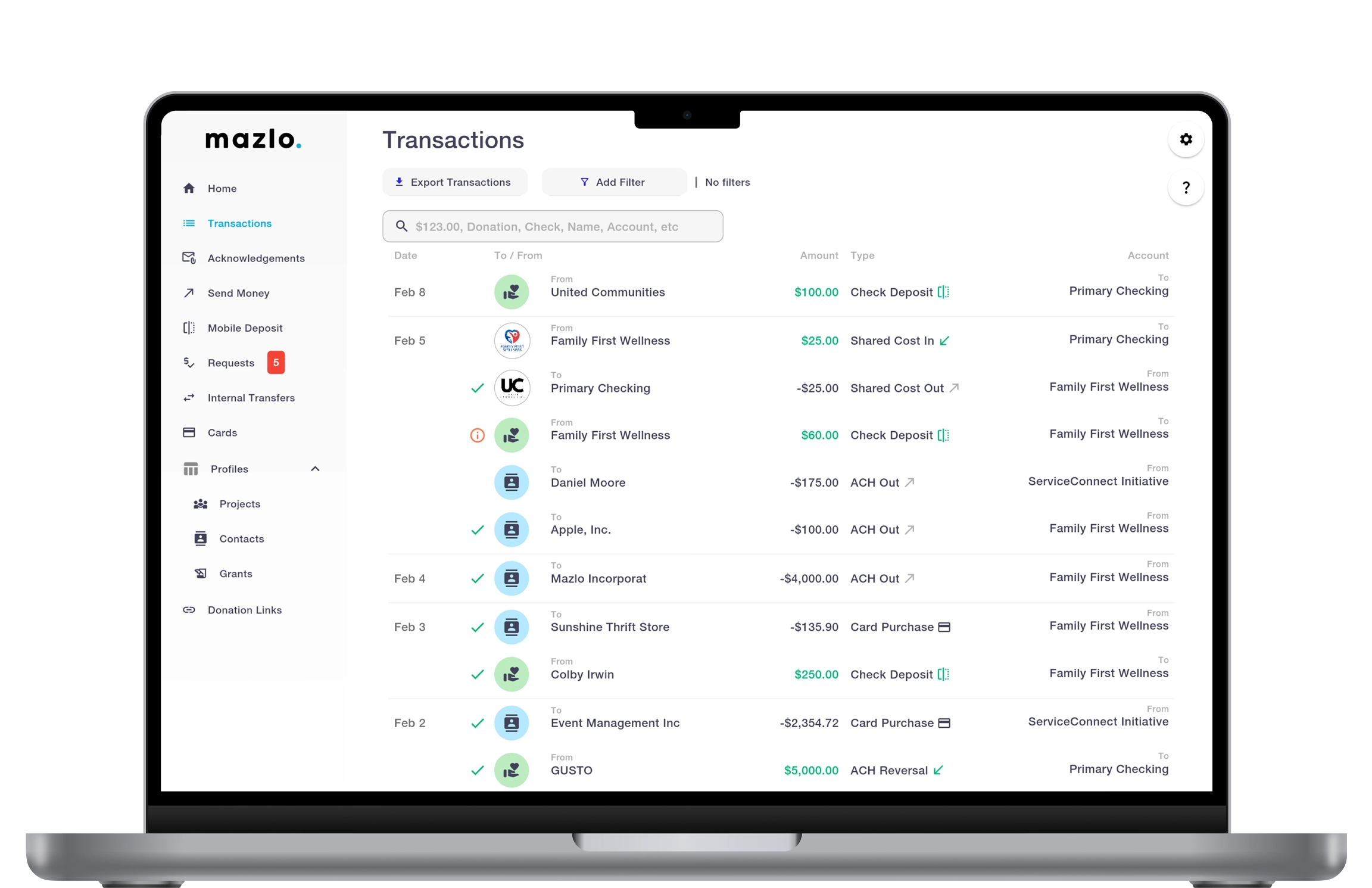 With Mazlo, compliance is integrated into every step of your workflow. Mazlo isn’t just a checking account, it’s your fundraising command center.