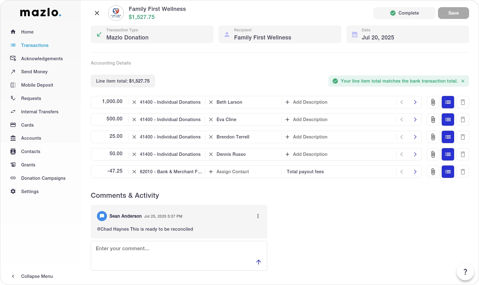 For a non-profit, every dollar in and dollar out triggers a workflow that has to be auditable and compliant. So, what we’ve done is we've taken those transactions and we’ve enriched them with accounting details, receipts, comment threads with staff and admins, statuses and more. In the case of a donation, adding specific accounting codes will trigger a generation of a donation acknowledgment letter.